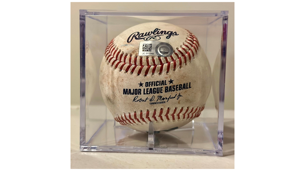 Orioles game ball from June 3rd, 2022 against the Cleveland Guardians in an acrylic case.